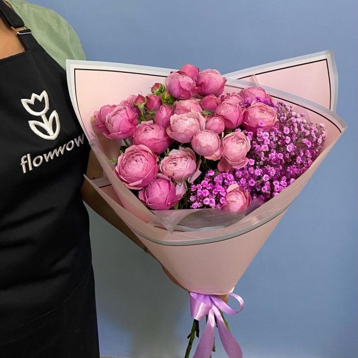 Лента атласная – 1 шт.Упаковка дизайнерская – 2 шт.Гипсофила розовая – 2 шт.пионовидная роза сильва – 5 шт.