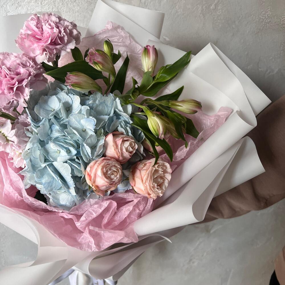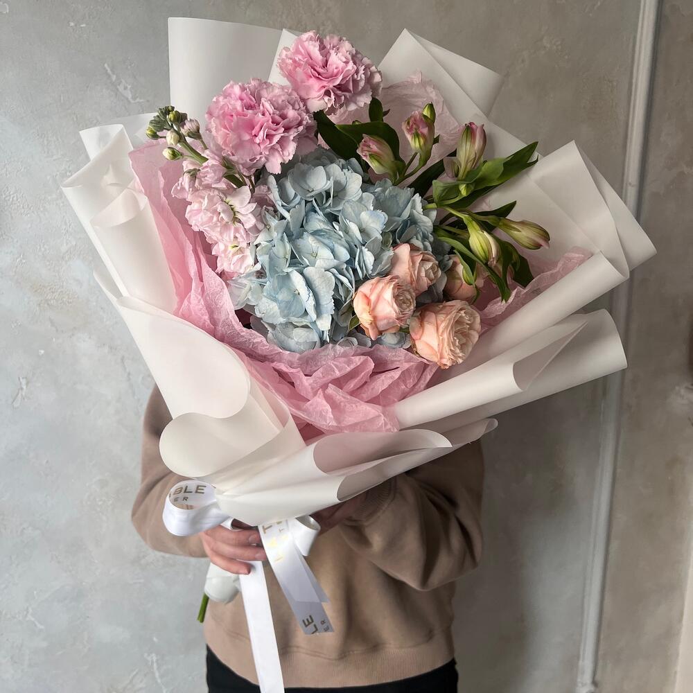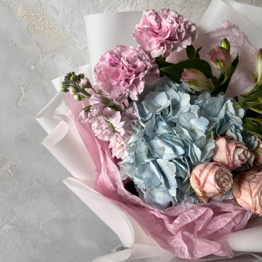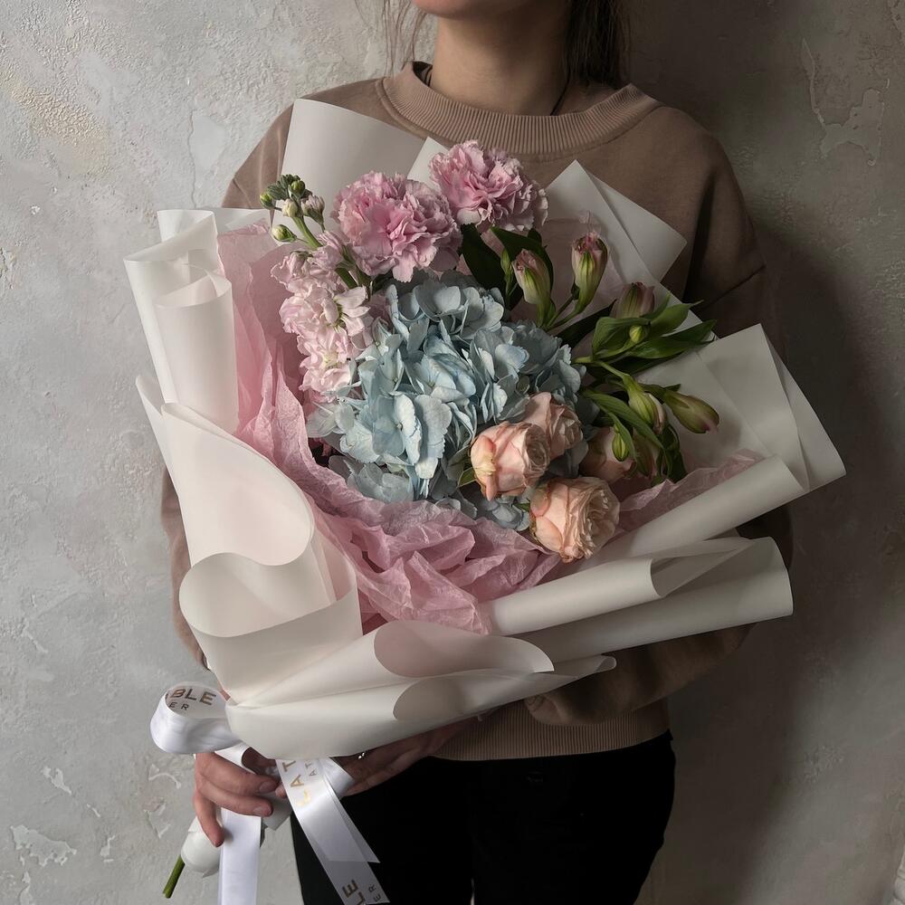 Альстромерия – 1 шт.Маттиола – 1 шт.Роза кустовая – 1 шт.Гвоздика – 2 шт.Упаковка дизайнерская – 1 шт.Гортензия голубая – 1 шт.