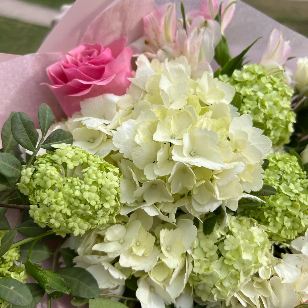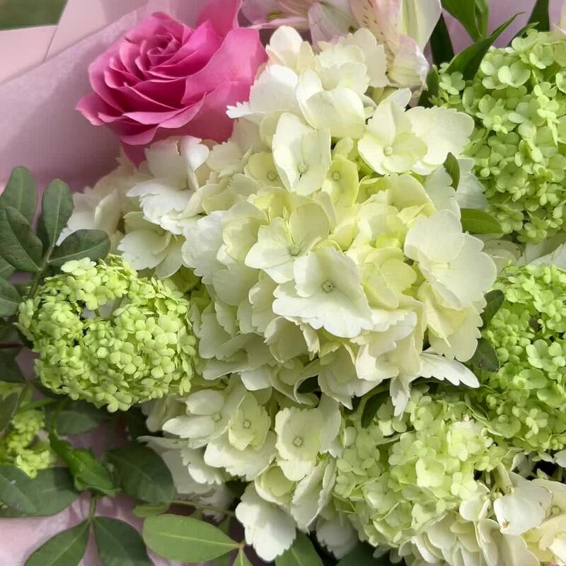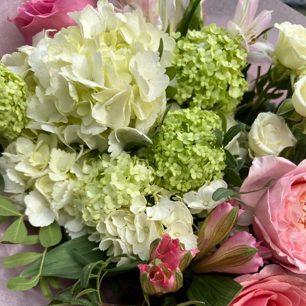 Альстромерия – 3 шт.Вибурнум – 3 шт.Гортензия – 1 шт.Роза кустовая – 1 шт.Роза Эквадор – 3 шт.Лента атласная – 2 шт.Тишью – 1 шт.Фисташка – 2 шт.Роза кустовая пионовидная – 1 шт.Упаковка дизайнерская – 1 шт.