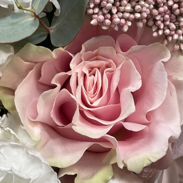 Лизиантус – 1 шт.Маттиола – 1 шт.Озотамнус – 1 шт.Эвкалипт – 1 шт.Роза одноголовая – 3 шт.Упаковка дизайнерская – 1 шт.