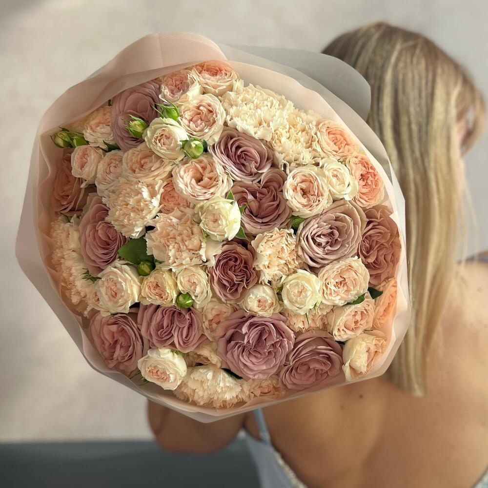 Диантус – 9 шт.Пионовидная роза – 12 шт.Атласная лента – 1 шт.Кустовая пионовидная роза – 7 шт.декоративная упаковка – 1 шт.