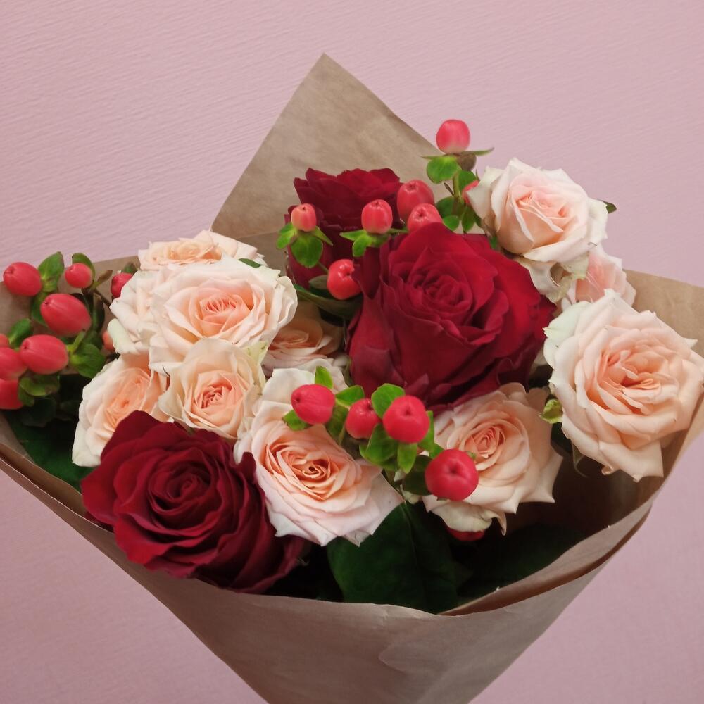 Гиперикум – 3 шт.Лента – 1 шт.Роза кустовая – 3 шт.Роза – 3 шт.Упаковка – 1 шт.зелень декоративная – 2 шт.