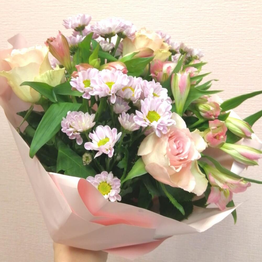 Альстромерия – 3 шт.Лента – 1 шт.Роза – 3 шт.Упаковка – 1 шт.Хризантема кустовая Сантини – 3 шт.