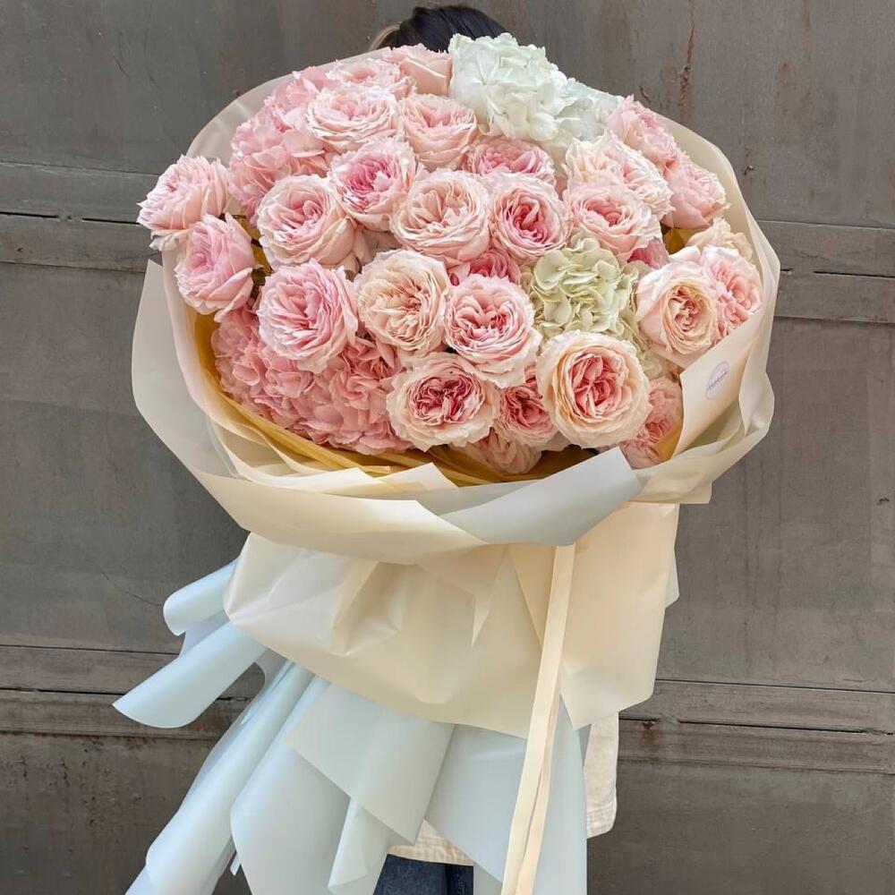 Букет из хризантемы и пионовидной розы «Марсель»(Роза кустовая пионовидная кения, хризантема Антонов, альстромерия)