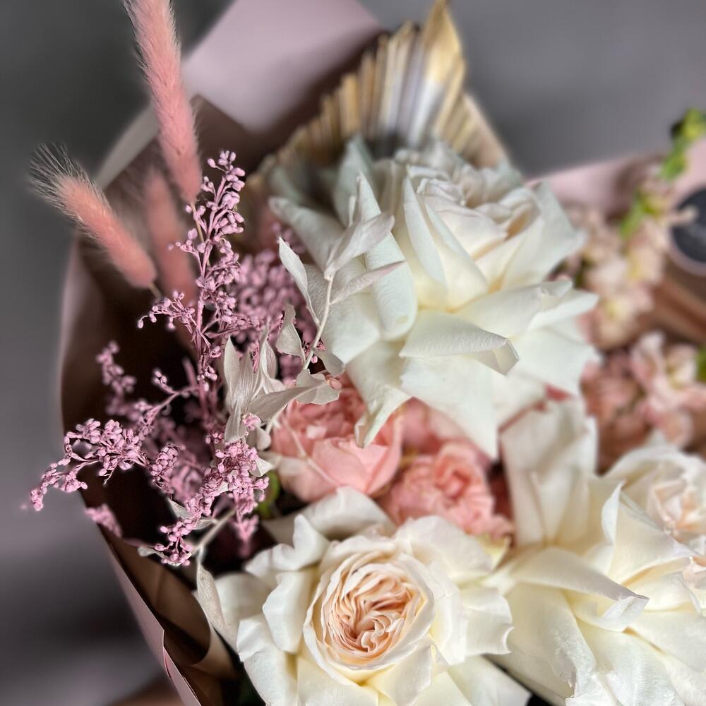 Пионовидная роза – 3 шт.Маттиола – 2 шт.Кустовая пионовидная роза – 1 шт.Перо – 1 шт.Лагурус – 4 шт.Рускус – 1 шт.Сухоцветы – 2 шт.декоративная упаковка – 1 шт.Атласная лента – 1 шт.
