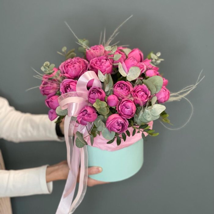Цветочная композиция в шляпной коробке с пионовидными розами”Мисти”