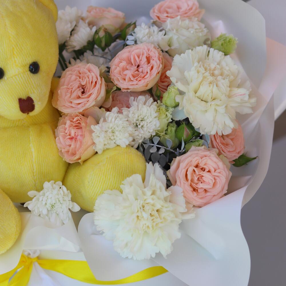 Цветы и мишка: цветочный подарок в коробке