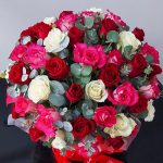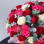 Лента атласная – 3 шт.Пленка матовая – 1 шт.Открыточка с вашими пожеланиями – 1 шт.Шляпная коробка большая – 1 шт.Оазис флористический – 2 шт.Эвкалипт Baby Blue – 9 шт.роза микс – 51 шт.транспортировочная упаковка – 1 шт.