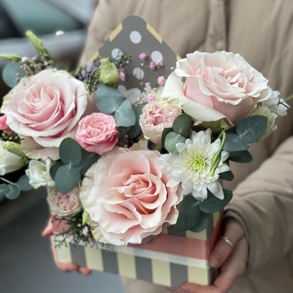 роза одноголовая пинк мондиаль – 3 шт.куст роза – 1 шт.эустома белая – 2 шт.Хризантема кустовая – 1 шт.Эвкалипт – 1 шт.Гипсофила – 1 шт.Зелень – 1 шт.