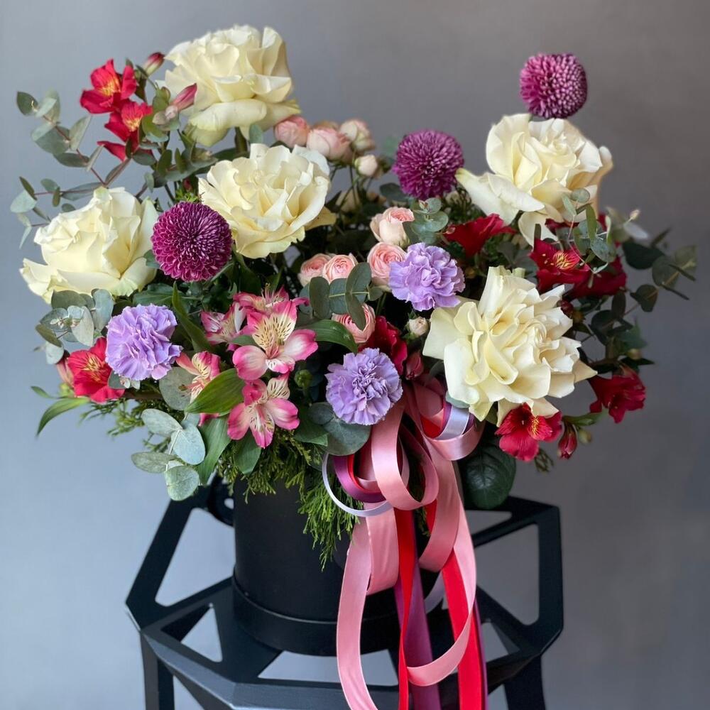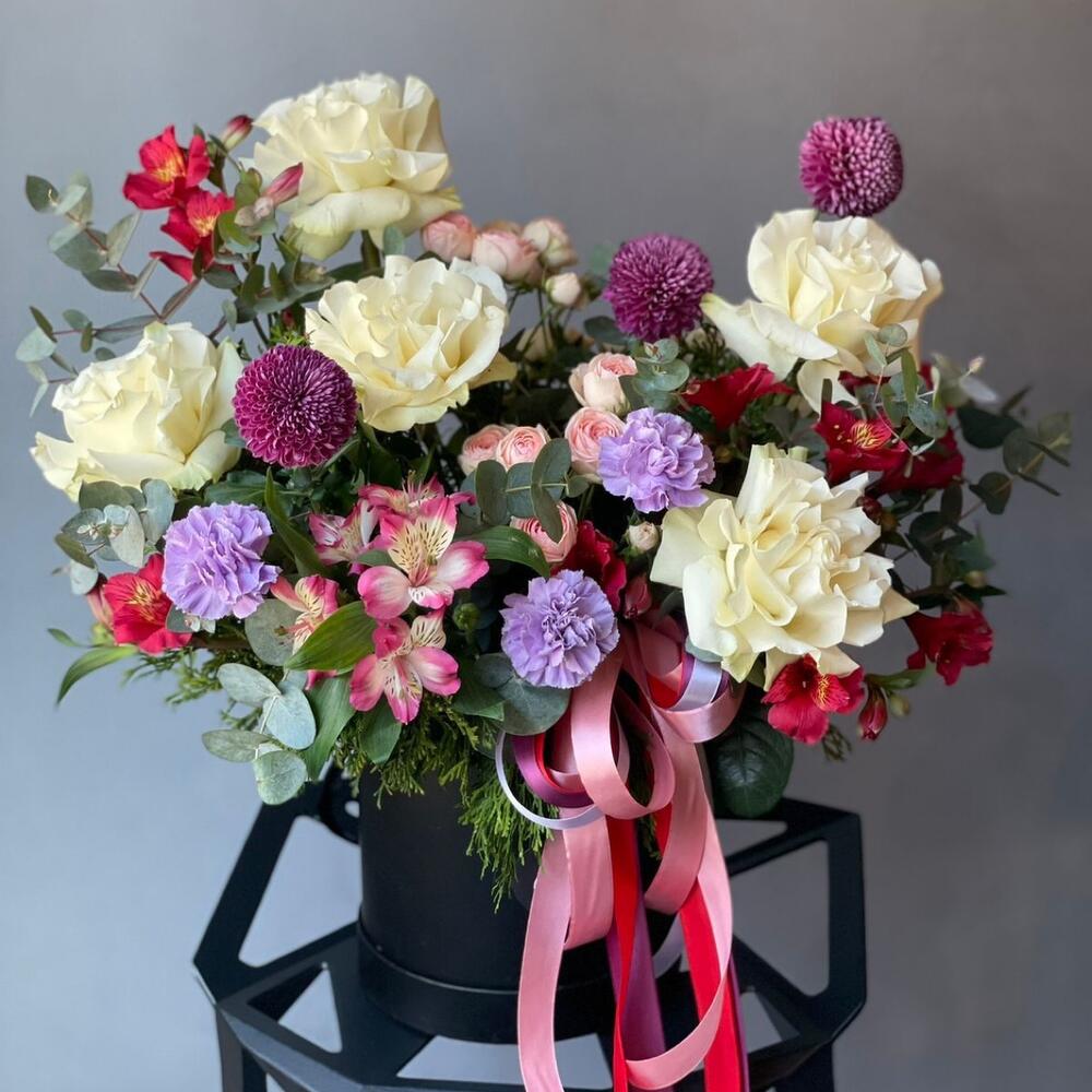 Яркая и нежная цветочная композиция из свежих цветов в коробке, украшенная лентами. Собрана на флористической губке.