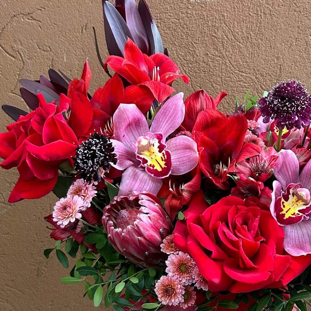 левкадендрон – 3 шт. ЦИМБИДИУМ – 3 шт. Роза французская – 5 шт. амариллис красный – 2 шт. Скабиоза стелата – 3 шт. Протея африка – 1 шт. ленты атласные – 2 шт. альстромерия бордо – 5 шт. коробка бархатная брендированная – 1 шт. хризантема сантини осенняя – 5 шт.