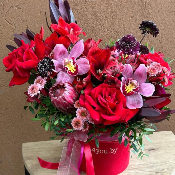 Страстная Алая коробка только для самых искушенных, ценящих роскошь и эстетику людей. Очень экстравагантная с экзотическим цветами, абсолютно не банальная композиция. Производит «вау» впечатление с первого взгляда !