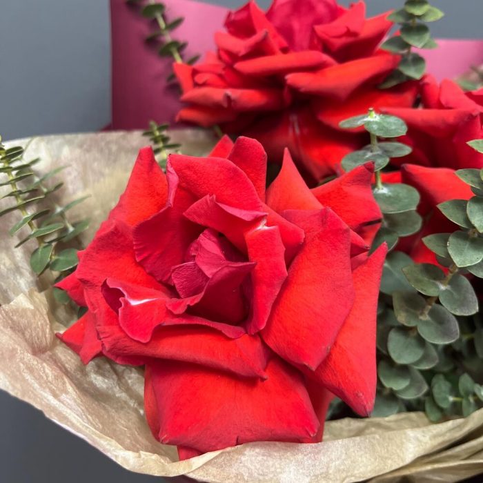 Лента атласная – 1 шт.Тишью – 1 шт.Эвкалипт Baby Blue – 3 шт.Упаковка корейская пленка – 1 шт.роза французская алая нина – 3 шт.