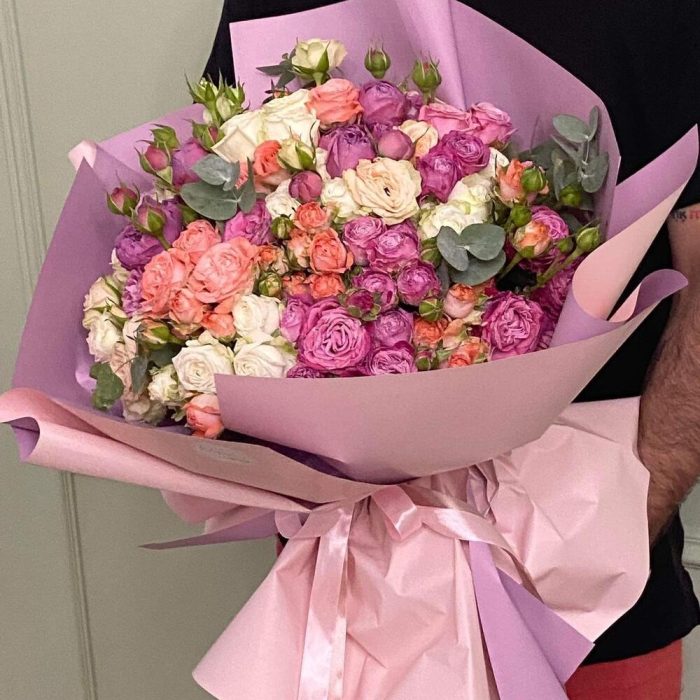 кустовые пионовидные розы – 51 шт. Упаковка дизайнерская – 5 шт. Атласная лента – 2 шт. Открыточка с вашими пожеланиями – 1 шт.