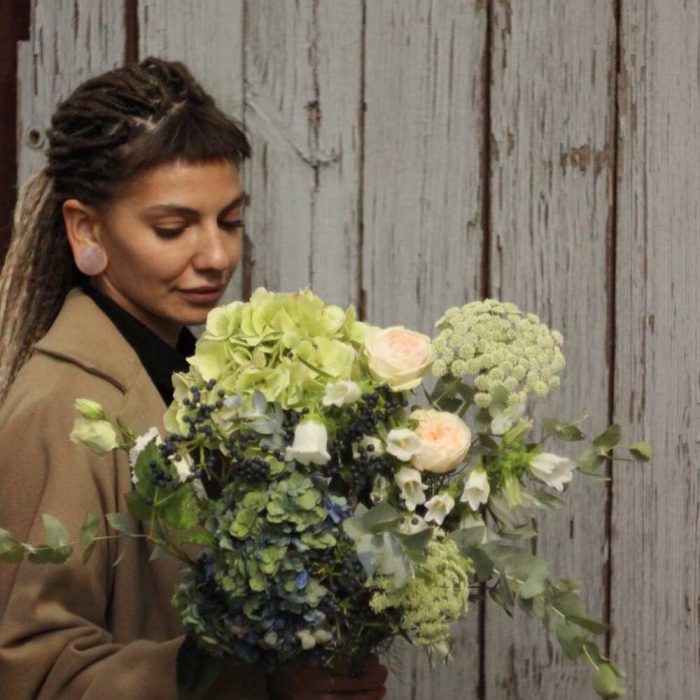 Гортензия – 2 шт.Роза пионовидная – 3 шт.Вибурнум ягодный – 1 шт.Колокольчик – 3 шт.зонтики – 3 шт.Лизиантус – 1 шт.Эвкалипт – 5 шт.Лента – 1 шт.