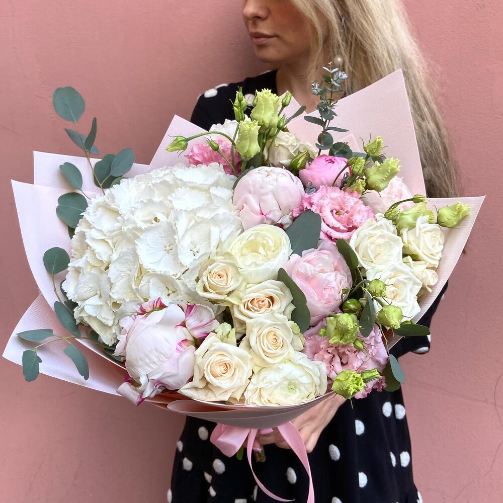 гортензия белая или розовая – 1 шт.Пион – 5 шт.Роза кустовая пионовидная – 5 шт.Лизиантус – 5 шт.Дизайнерская упаковка – 1 шт.открытка с вашими пожеланиями – 1 шт.