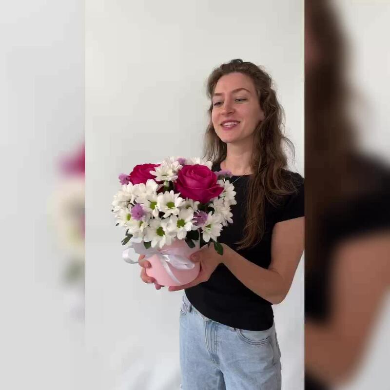 Хризантемы ромашки с розами в коробке «Мамина любовь»