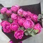 Роза кустовая пионовидная – 5 шт.Эвкалипт ценарея – 3 шт.Упаковка дизайнерская – 1 шт.