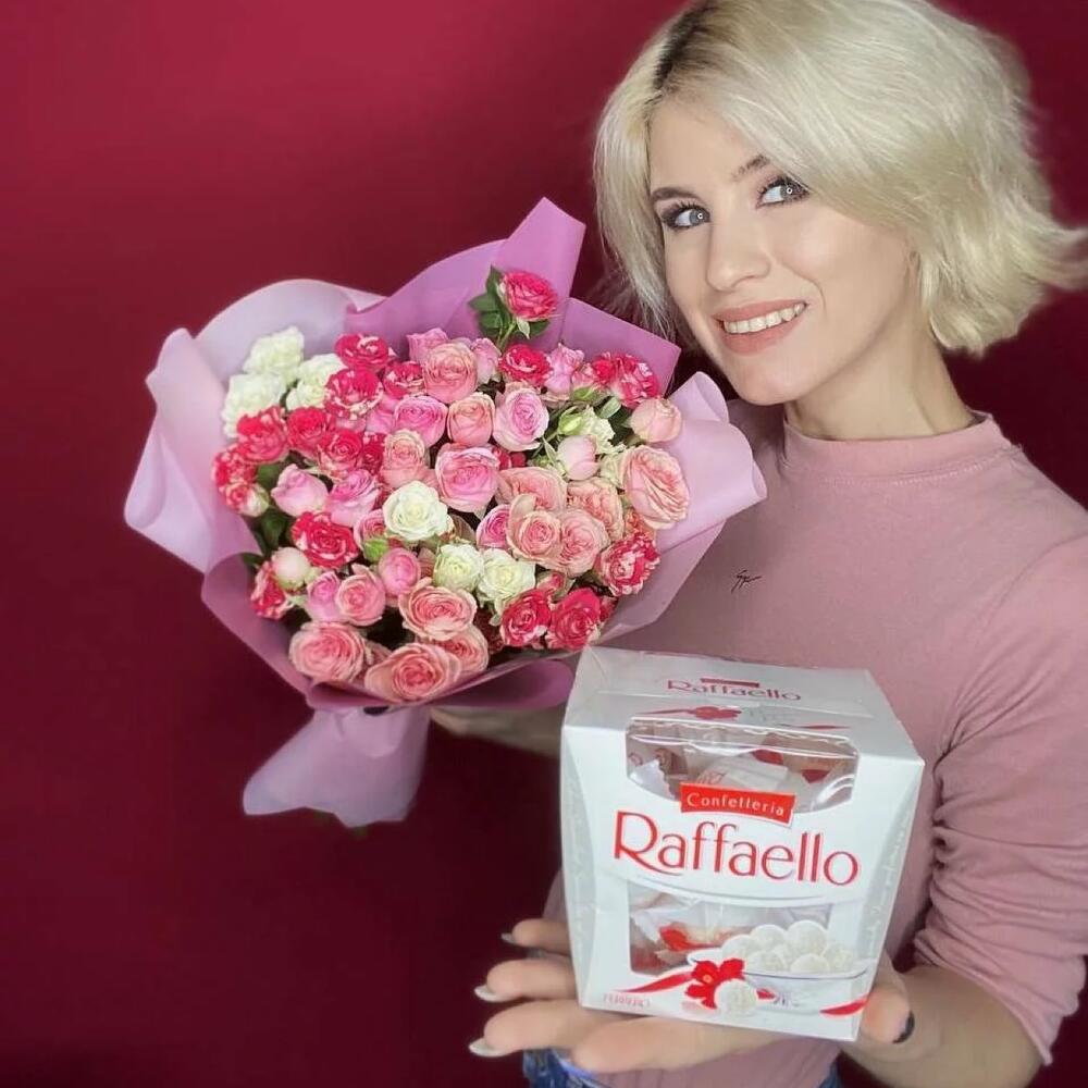 Упаковка – 1 шт.раффаэлло 150 гр – 1 шт.розы кустовые микс – 15 шт.