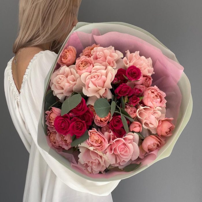 11 кустовых пионовидных роз в дизайнерской упаковке