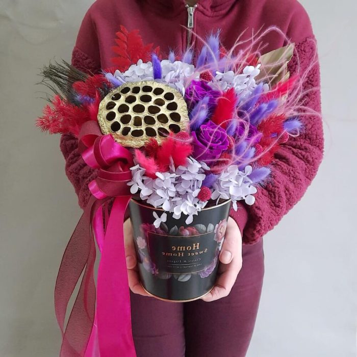 Роза стабилизированная – 3 шт.лагурус пучок – 2 шт.гортензия стабилизированная – 1 шт.ковыль пучок – 1 шт.краспедия стабилизированная – 6 шт.аспарагус стабилизированный – 2 шт.комыш декоративный – 3 шт.пальма сухоцвет – 1 шт.папоротник стабилизированный – 1 шт.перо павлина декоративное – 1 шт.Лотос (коробочка) – 1 шт.Оазис флористический – 1 шт.Лента атласная – 2 шт.Кашпо металлическое – 1 шт.