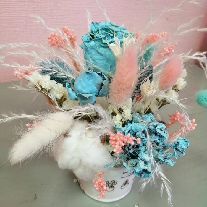 Роза сухоцвет – 1 шт.эхинацея сухоцвет – 2 шт.Озотамнус розовый – 1 шт.Хлопок натуральный – 1 шт.Лагурус (сухоцвет) – 6 шт.статица сухоцвет – 1 шт.Ковыль – 1 шт.кашпо ведерко – 1 шт.Оазис флористический – 1 шт.