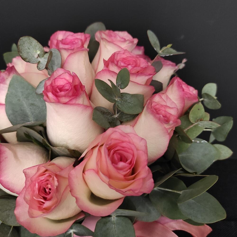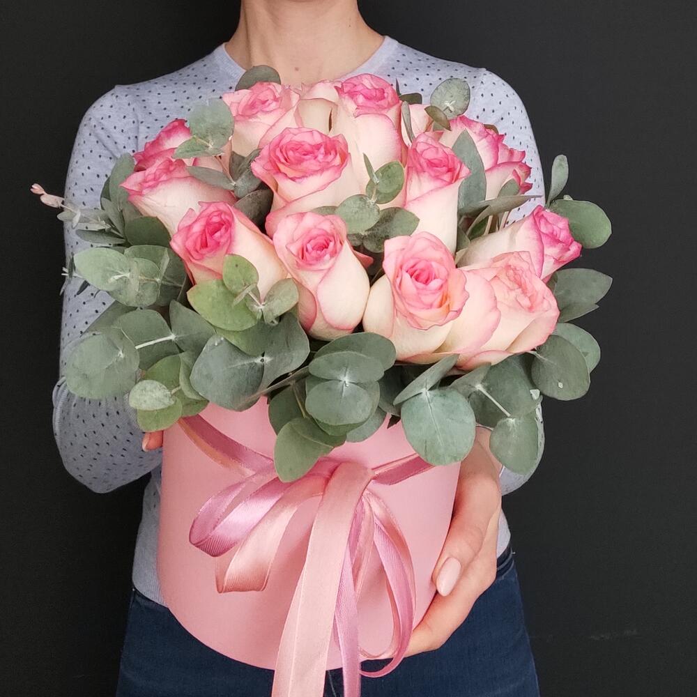 Роза – 19 шт.Эвкалипт – 2 шт.Оазис флористический – 2 шт.Коробка шляпная – 1 шт.