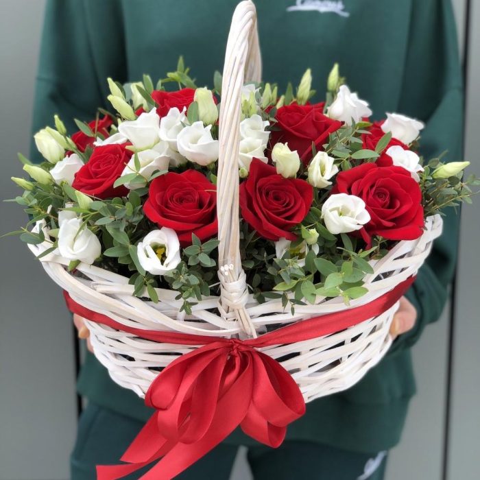 Эустома – 4 шт. Эвкалипт – 3 шт. красная роза фридом – 11 шт. Корзина – 1 шт. Оазис – 2 шт. Оформление – 1 шт.