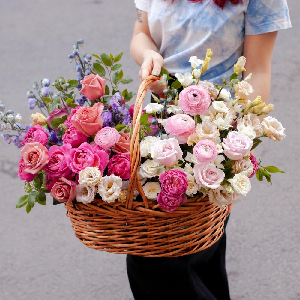 Дельфиниум – 4 шт.Ранункулюс розовый – 4 шт.Роза пионовидная кустовая – 5 шт.Лизиантус – 5 шт.Диантус – 4 шт.роза бариста – 5 шт.роза свит эскимо – 3 шт.козина плетеная – 1 шт.зелень декоративная – 5 шт.