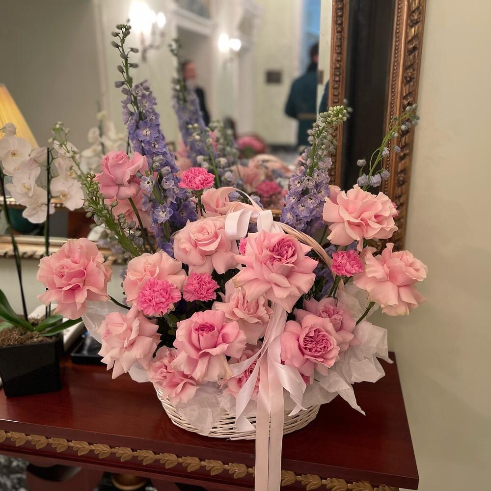 Дельфиниум – 10 шт.Корзина – 1 шт.Тишью – 3 шт.Диантус – 25 шт.Оазис флористический – 3 шт.роза ажурная – 25 шт.