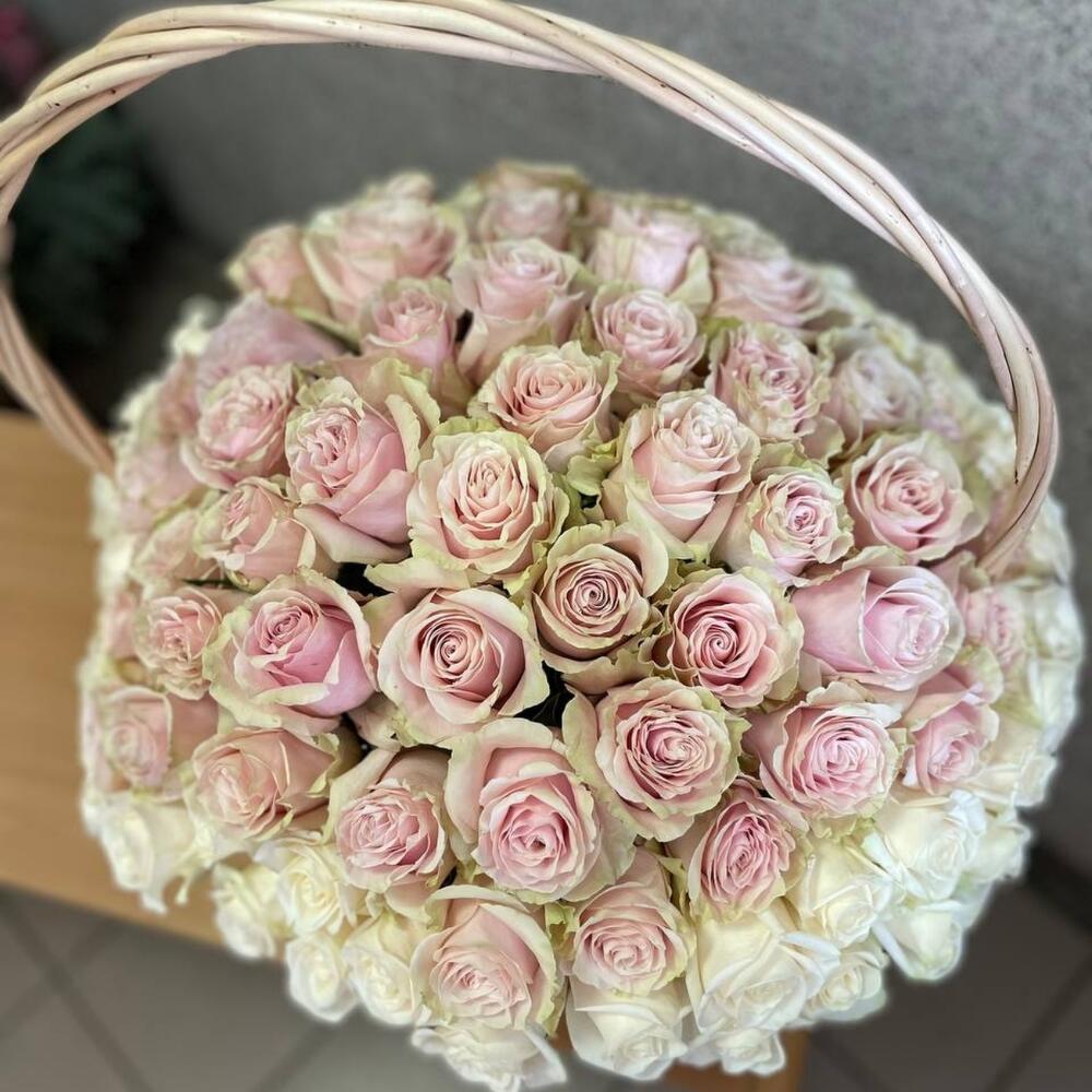 Роза Эквадор – 99 шт.Лента атласная – 2 шт.Корзина плетеная – 1 шт.Упаковка дизайнерская – 2 шт.