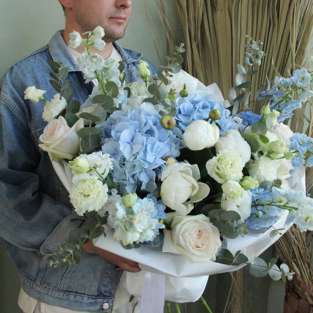 Гортензия – 2 шт.Дельфиниум – 5 шт.Лента – 1 шт.Лизиантус – 5 шт.Пион – 5 шт.Эвкалипт – 5 шт.Упаковка – 1 шт.Фисташка – 3 шт.Роза пионовидная – 5 шт.