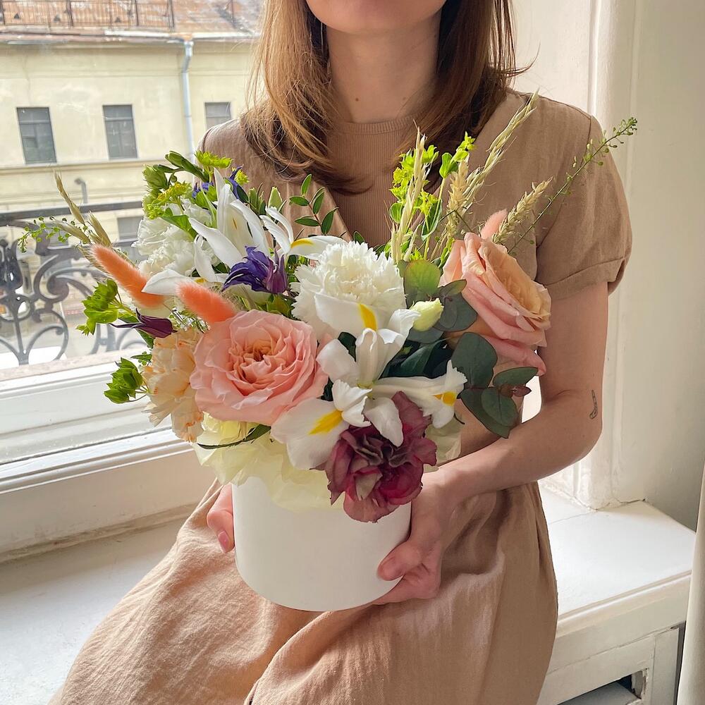 Роза персиковая – 2 шт.Диантус – 4 шт.Клематис – 1 шт.Ирис – 2 шт.Буплерум – 1 шт.Лагурус – 2 шт.овес сухоцвет – 2 шт.Эвкалипт – 1 шт.Коробка шляпная – 1 шт.Губка флористическая – 1 шт.
