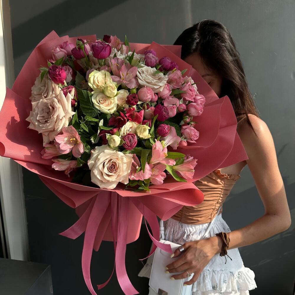 Корзина из альстромерий,розовых роз и зелени Синтия