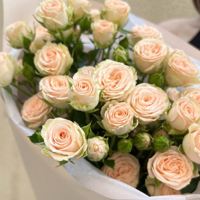 Лента атласная – 2 шт.Упаковка дизайнерская – 2 шт.Упаковка тишью – 1 шт.подкормка для срезанных цветов – 1 шт.кустовые пионовидные розы – 5 шт.