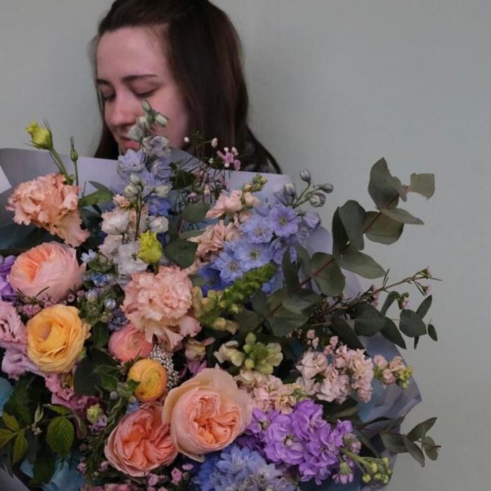 Роза пионовидная – 5 шт.Ранункулюс – 5 шт.Дельфиниум – 5 шт.Маттиола – 3 шт.Эустома – 3 шт.Ваксфлауэр – 2 шт.Озотамнус – 2 шт.Эвкалипт – 5 шт.Львиный зев – 3 шт.Упаковка – 1 шт.
