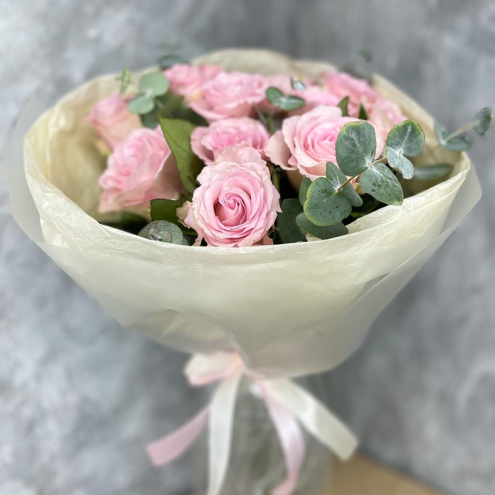 Роза – 11 шт.Эвкалипт – 2 шт.Упаковка дизайнерская – 2 шт.Лента атласная – 2 шт.