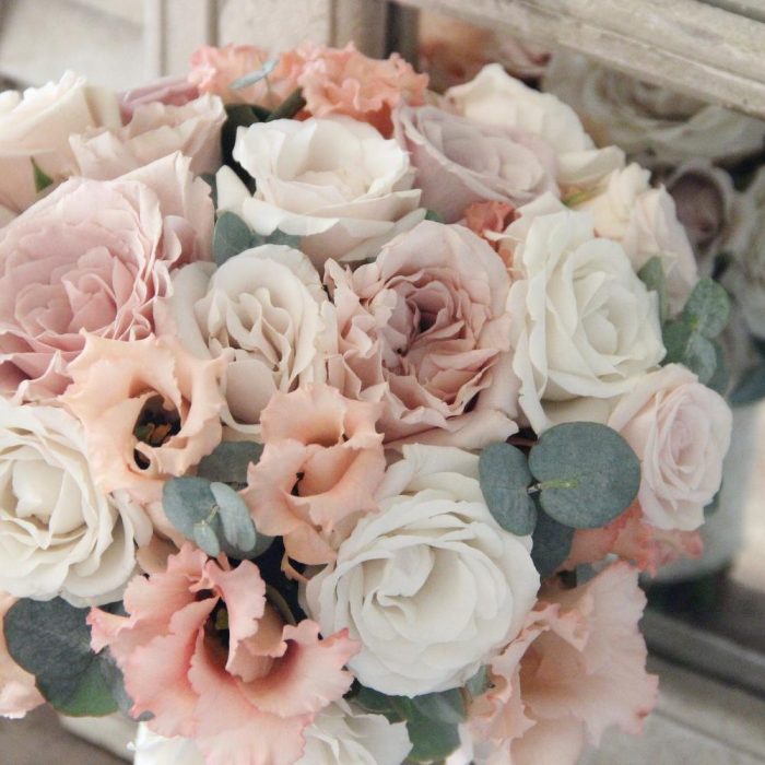 Роза голландия сортовая – 11 шт.лизиантус априкот – 7 шт.Роза кустовая – 5 шт.Эвкалипт – 4 шт.Фисташка – 4 шт.Кружево – 1 шт.