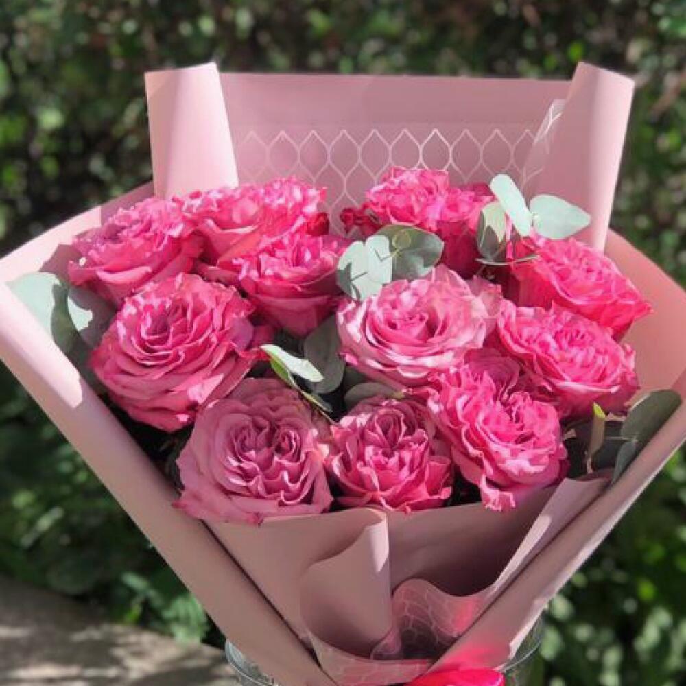 Упаковка дизайнерская – 1 шт.Роза пионовидная – 11 шт.Эвкалипт – 3 шт.