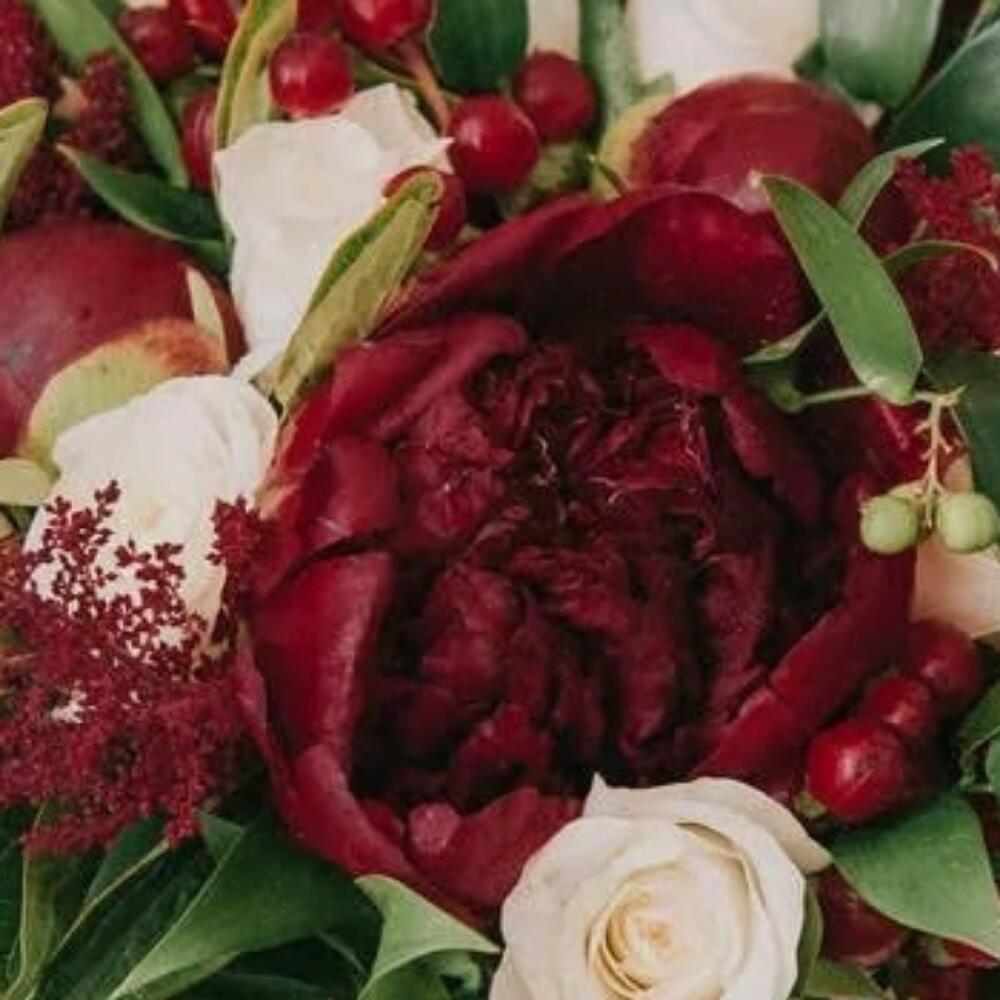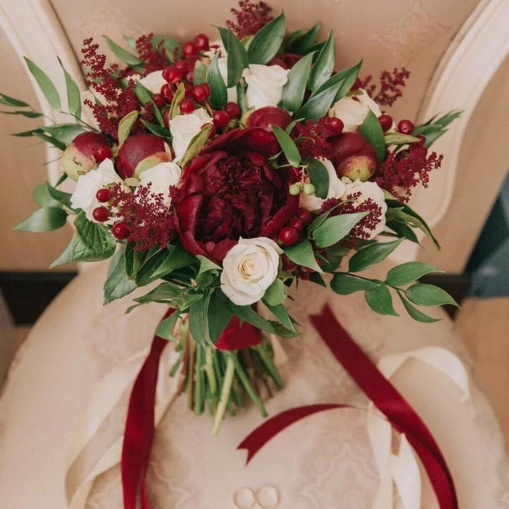 пионы бордовые – 9 шт.Роза одноголовая – 7 шт.Хиперикум красный – 5 шт.зелень декоративная – 15 шт.Лента атласная – 2 шт.