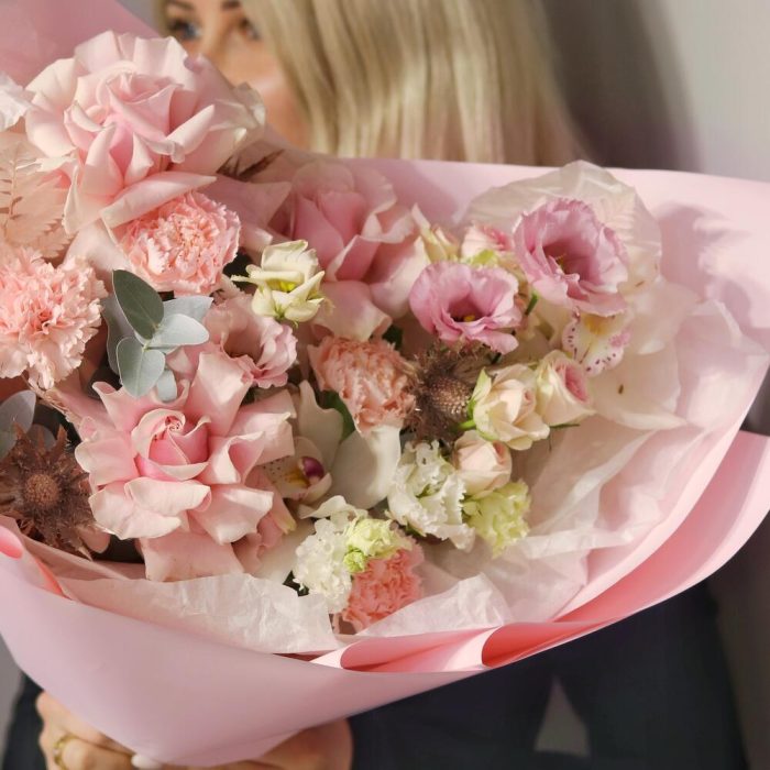 Диантус – 4 шт.Кустовая пионовидная роза – 2 шт.Французская роза – 3 шт.Эвкалипт крашеный – 1 шт.эустома белая – 1 шт.Сантини – 2 шт.