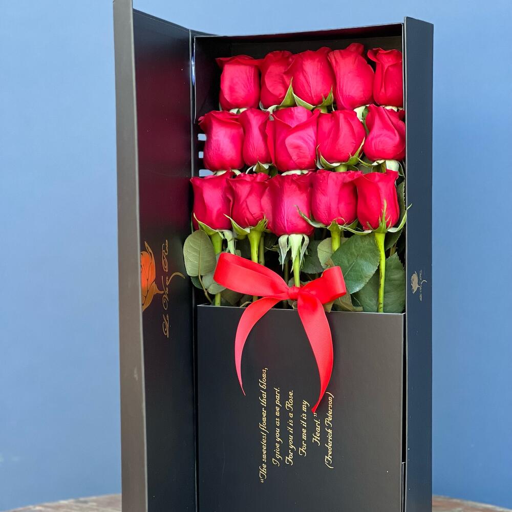 Лента атласная – 1 шт. Роза голландия – 15 шт. Оазис флористический – 1 шт. Футляр – 1 шт.