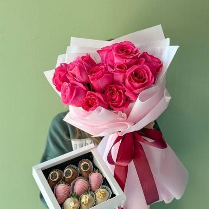 Сет “Emily”. Моно букет роз и коробочка клубники в шоколаде