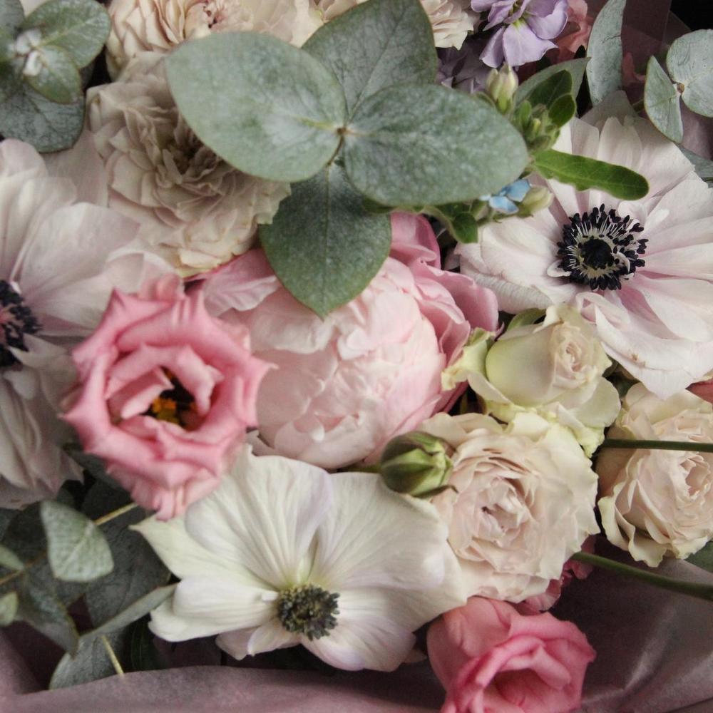 Авторский нежный букет с анемонами, пионами, твидией, матиоллой, лизиантусом и ароматным эвкалиптом, в локаничной упаковке.Стильное цветочное решение для любого случая .