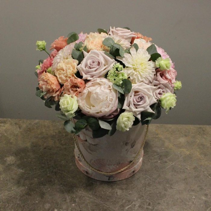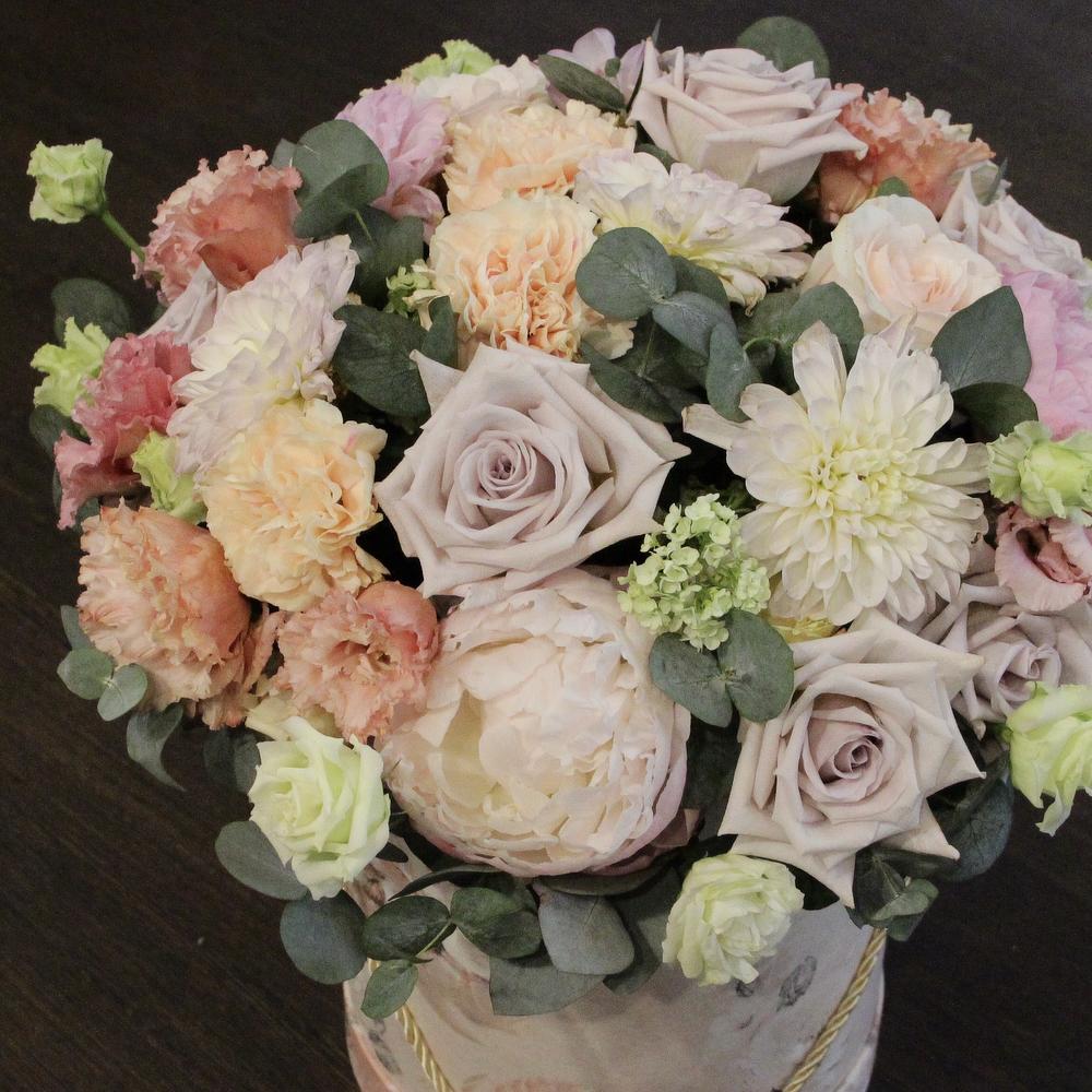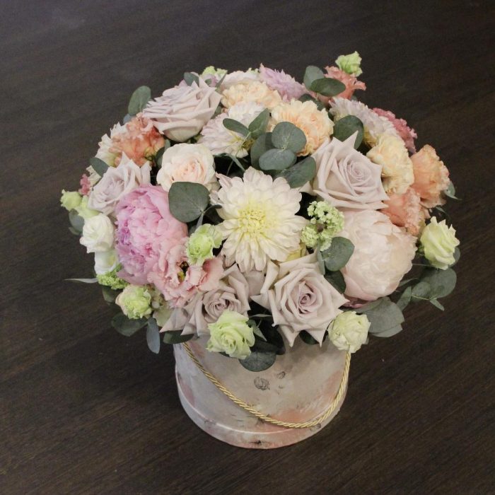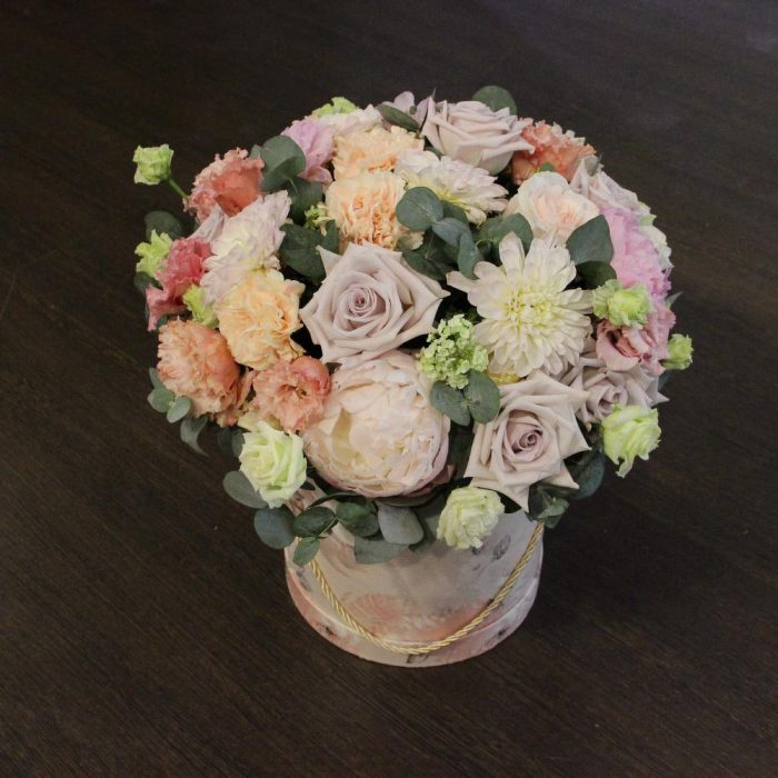 Цветы в коробке из пионовидныз роз, хризантем и Гербер