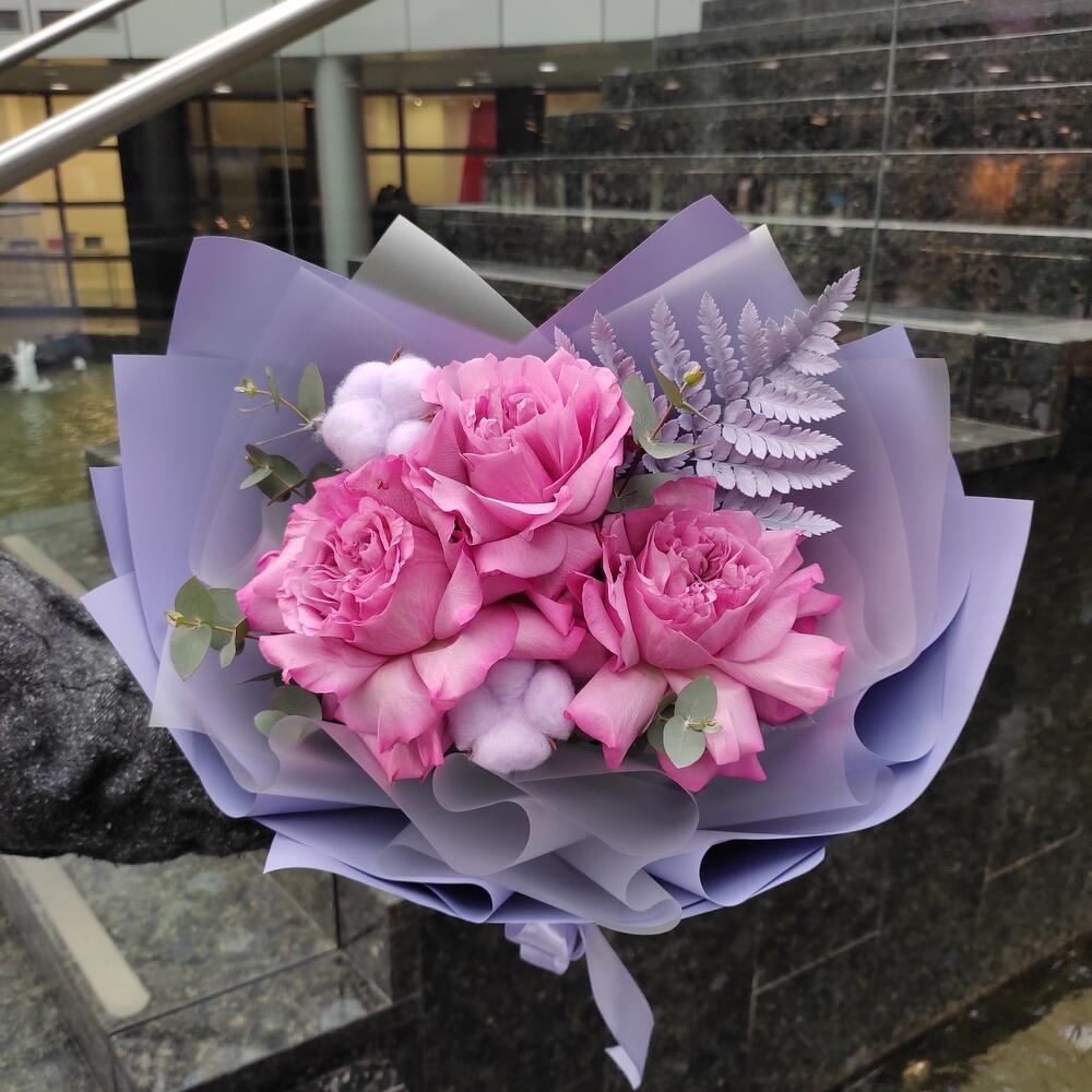 Роза пионовидная – 3 шт.Хлопок – 2 шт.Эвкалипт – 1 шт.Папоротник – 1 шт.Упаковка дизайнерская – 2 шт.Лента атласная – 2 шт.