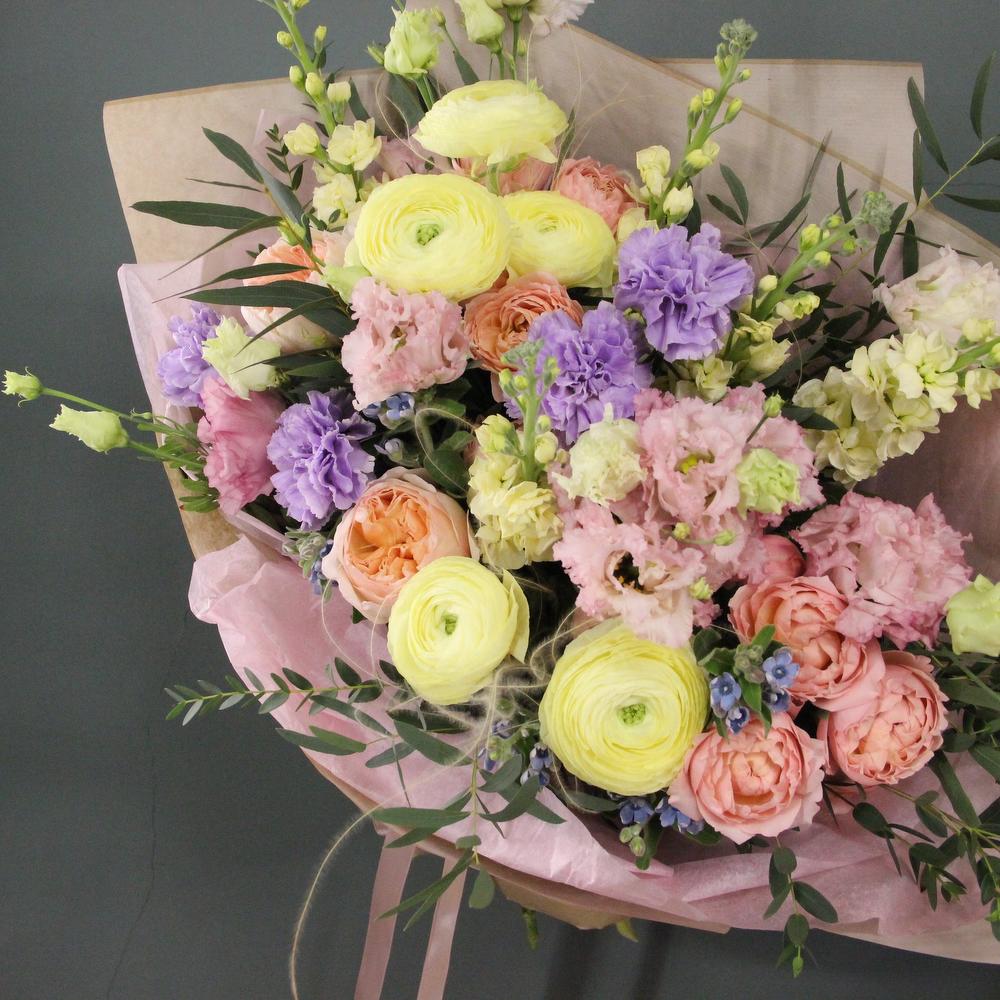 Авторский букет с ранункулюсами, пионовидными розами, ароматными маттиолами, диантусом, твидией, лизиантусом и эвкалиптом.Ширина букета около 70 сантиметров, высота букета около 60 сантиметров.Стильное цветочное решение для любого случая.Отличный выбор для подарка … Показать ещёна день всех влюблённых, 14 февраля.