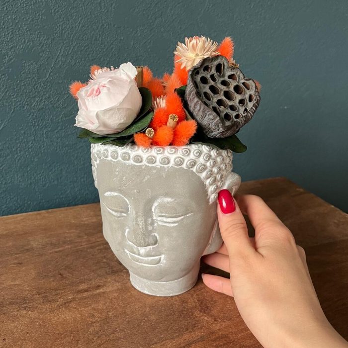 Это не просто букет цветов. А композиция, которая несет в себе философию, что наша жизнь цикличнаПионовидная роза – как распускающийся цветущий лотос А рядом с ней уже сухоцветный лотос, который уже отцвел, но в нем хранятся семена, которые в дальнейшем дадут жизнь новым цветкамЯркий оранжевый лагурус символизирует оранжевое одеяние Будды——————————————————Роза в композиции настоящая, прошедшая специальную обработку стабилизацииБукет из сухоцветов и стабилизированных цветов не завянет, а будет радовать несколько летСухоцветы не требуют трепетного ухода, ведь им не нужна вода, они не притягивают пыль, и сами не осыпаютсяК букету прилагается памятка, как сохранить внешний вид букета на несколько лет