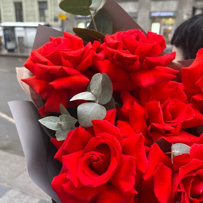 Эвкалипт – 3 шт.Лента атласная – 2 шт.Упаковка корейская пленка – 1 шт.французские розы – 7 шт.