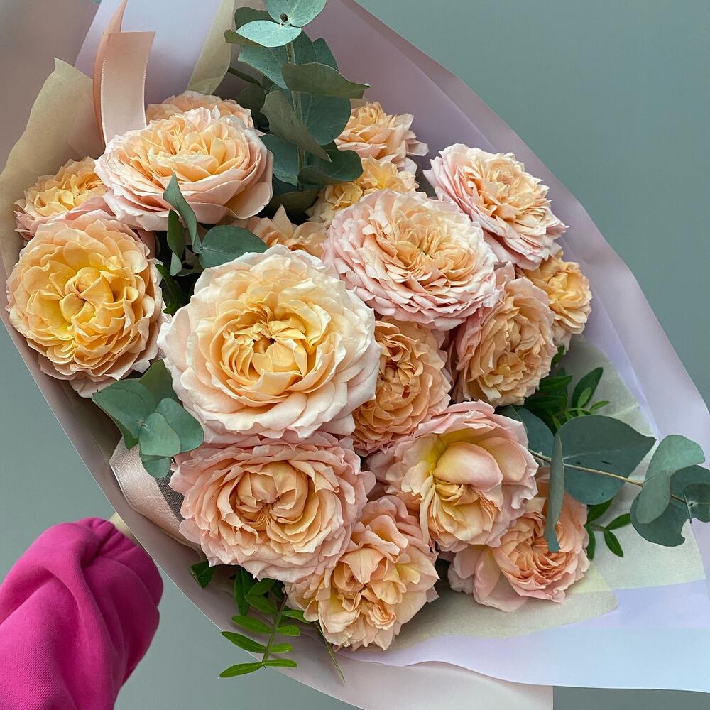 Роза пионовидная кустовая – 3 шт.Фисташка – 3 шт.Эвкалипт – 3 шт.Пленка матовая – 4 шт.